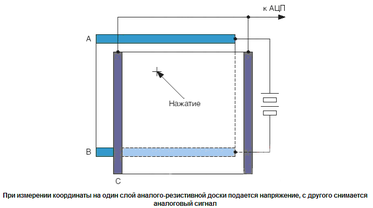 При нажатии поверхность доски прогибается, резистивные листы соприкасаются в точке нажатия. Встроенные электронные коммутаторы подключают электроды A и B к источнику постоянного напряжения, замыкают электроды C и D между собой и подключают их к входу аналого-цифрового преобразователя. На его выходе появляется код, определяющий вертикальную координату. Затем схемы перекоммутируются так, чтобы напряжение подавалось на электроды C и D, а снималось с электродов A и B. В этот момент аналого-цифровой преобразователь регистрирует код, соответствующий горизонтальной координате.