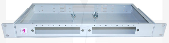 Монтаж волоконно-оптического кабеля осуществлен в оптический кросс типа КРС-16SC-1U. Кросс строго соответствует метрическим размерам и предназначен для концевой заделки, распределения и коммутации оптических кабелей связи. Высота кросса - 1U. Емкость оптического кросса – до 16 оптических портов FC, ST, SC, MT-RJ типов. Конструкция рэкового кросса КРС-16 предусматривает специальные гнёзда для установки адаптерных планок. На лицевой части корпуса нанесена маркировка портов. Корпус стоечного оптического кросса изготовлен из стали и покрыт порошковой краской. Данный кросс отлично подходит к проекту видеонаблюдения. Вид кросса КРС-16SC-1U показан на рисунке 12.