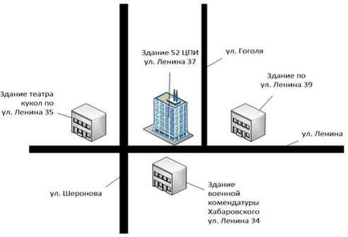 Объект информатизации находится в собственном семиэтажном здании по адресу ул. Ленина, 37. Здание со всех сторон окружено используемыми нежилыми помещениями. Фасад здания выходит на ул. Ленина. С одной стороны находится здание школы (ул. Ленина, 39), с другой Хабаровский краевой театр кукол. На противоположной стороне улицы, находится здание военной комендатуры Хабаровского края (ул. Ленина, 34). План – схема местности, в которой находится защищаемый объект, показана на рисунке 2.1.
