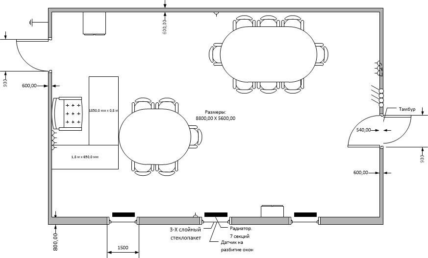 дверной тамбур глубиной 540 мм и двумя дверьми с прокладкой из пористой резины (размеры двери –2,2 х 0,9 м), массив дуба;