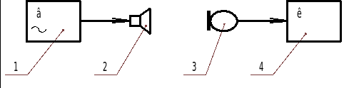 1 – устройство формирования тестового акустического сигнала (гармонического или « белого» шума) УФТС; 2 – акустический излучатель; 3 – датчик (преобразователь акустического сигнала в электрический) – измерительные микрофон/виброакустический преобразователь; 4 – измерительное устройство – шумомер со встроенными фильтрами (октавными, третьоктавными и т.п.) либо спектроанализатор.