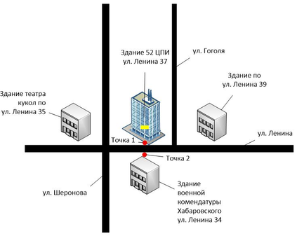 расстояние от точки «2» до защищаемого помещения составляет около 100м, что позволяет снять информацию сверхмощным направленным микрофоном (SP3225) рассчитанного на расстояние до 250м.