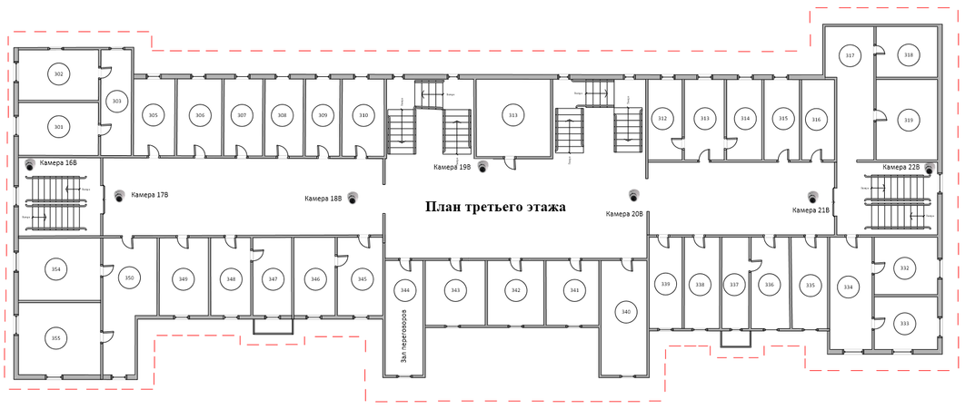 Расположение компонентов системы видеонаблюдения на первом – третьем этажах здания представлено на рисунках 1.3 – 1.5. Расположение компонентов системы на четвертом и пятом этажах аналогично их расположению на третьем этаже.
