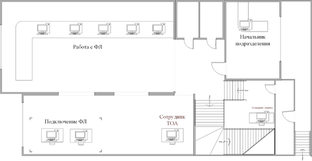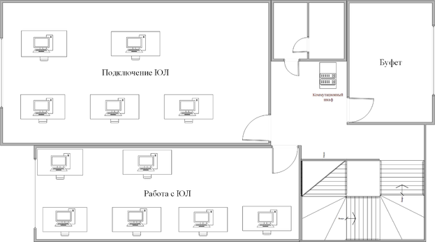 На втором этаже находится сектор по работе с юридическими лицами. Так же на втором этаже находится коммутационный шкаф, который связывает все АРМ подразделения в одну ЛВС и позволяет обмениваться информацией с центром обработки данных.