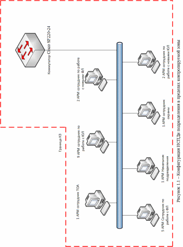 Сотрудник технического обслуживания абонентов имеет доступ к установке и настройке программного обеспечения, изменению конфигураций сети и устройств. Персональные данные хранятся на серверах центра обработки данных и на жестких дисках автоматизированных рабочих мест пользователей, к которым имеет доступ ограниченный перечень лиц. Конфигурация ИСПДн и топологии локально вычислительной сети (далее ЛВС) представлены на рисунке 1.1.