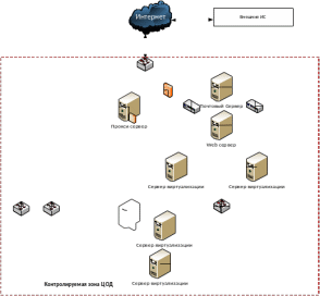 Все ИС, которые используют вычислительные мощности ЦОД для централизованного управления введены в один домен. В качестве контроллера домена используется виртуальная машина под управлением операционной системы Windows server 2012. Маршрутизацией между сегментами сети и доступом в интернет управляет сертифицированный ФСТЭК-ом сервер под управлением операционной системы Altlinux.