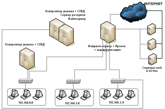 Все ИС, которые используют вычислительные мощности МИС МКУ «ЦОД» для централизованного управления введены в один домен. В качестве контроллера домена используется виртуальная машина под управлением операционной системы Windows server 2012. Маршрутизацией между сегментами сети и доступом в интернет управляет сертифицированный ФСТЭК-ом сервер под управлением операционной системы Altlinux.