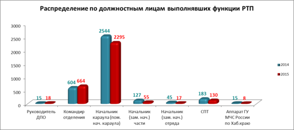 Анализ участия должностных лиц (рисунок 1.6), выполнявших функции РТП, выявил, что большинство пожаров тушится начальниками караулов (помощниками начальников караулов) 2295 (72 %) и командирами отделений 664 (21 %), должностными лицами СПТ потушено 130 пожаров (4,1 %), руководство пожарных частей выполняло функции РТП 55 раз (1,7 %), руководство отрядов – 17 раз (0,5 %), сотрудники Главного управления – 8 раз (0,3 %).