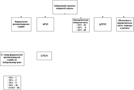 Среди них 6 частей ФПС МЧС, 5 из которых входят в «21 отряд федеральной противопожарной службы Хабаровского края». А также 10 объектовых и 14 ведомственных частей, команд и расчетов. Объектовые отвечают за объект, на базе которого они дислоцированы, а ведомственные ответственны за объекты своего ведомства и подчиняются руководству данного ведомства. Структура гарнизона представлена на (рисунке 2.1).