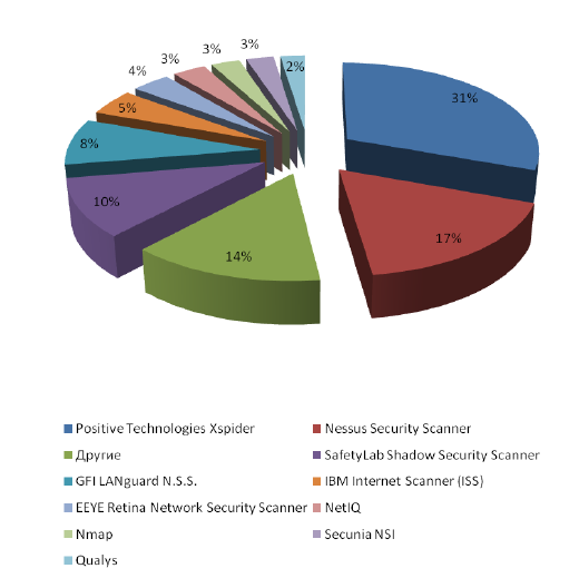 Результат опроса респондентов (рисунок 2.4) о конечных продуктах, имеющих отношение к сканерам безопасности, показал, что большинство организаций предпочитают использовать продукт Positive Technologies XSpider (31%) и Nessus Security Scanner (17%).
