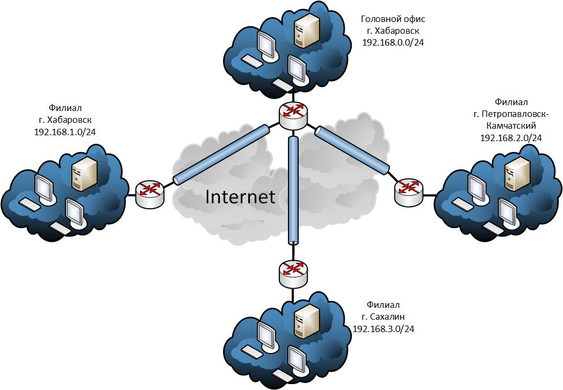 Информационная система предприятия включает в себя четыре офиса, связанных между собой VPN (виртуальной частной сетью). Головной офис и один из филиалов территориально расположены в городе Хабаровск. И два офиса находятся на территории Дальнего Востока в городах Петропавловск-Камчатский и на Сахалине. Схему сети информационной системы можно увидеть на рисунке 3.1.