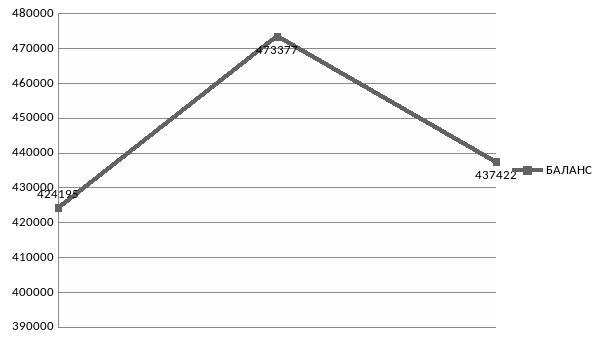 Если сравнивать данные за 2016 г. и 2015г., то видно, что валюта баланса будет больше в 2015 г. Сокращение произошло на 7,6%, что в абсолютном выражении составило 35 955 руб. Так, в 2016 г. актив баланса, следовательно, и валюта баланса составили 437 422 руб.