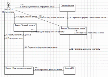 На рисунке 2.14 изображена диаграмма коммуникации «Оформление заказа». На данной диаграмме подробное описание (в том числе и последовательность) того, что пользователь делает при выборе пункта меню «Оформить заказ». Первым делом пользователь попадает на главную форму и переходит уже непосредственно к оформлению заказа в соответствующую форму. Затем он выбирает параметры (шоу, дату, время) заказа, если же какой из параметров уже занят, то выдается сообщение на экране о выборе других параметров, если же все свободно, то переходит к форме «Способ оплаты», на данной форме указывает контактные данные и переходит на форму «Подтверждение заказа». Созданный пользователем заказ сохраняется на сервере нашей информационной системы.