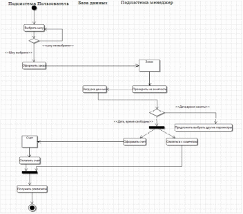 На рисунке 2.15 приведена диаграмма деятельности «Оформление заказа». На диаграмме показаны процессы, возникающие при оформлении заказа. Перед оформлением заявки, пользователь должен выбрать интересующее его шоу. После начнется процесс оформления заказа. Менеджер должен проверить занятость данных параметров, указанных при оформлении заказа. Для этого он обращается к серверу ИС. Если параметры заняты, то менеджер предлагает клиенту выбрать другие параметры для осуществления заказа. Если ключ присутствует, то оформляет счет и связывается с клиентом, уточняя его контактные данные, указанные при оплате заказа. Счет отправляется пользователю, когда он его оплатит, ему придет письмо об успешном оформлении заказа на электронную почту.