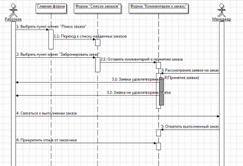 На рисунке 2.13 изображена диаграмма последовательности для процесса «Бронирование заказа». Работник выбирает пункт меню «Поиск заказа», вводит параметры поиска и переходит на форму «Список заказов». Затем он нажимает «Забронировать заказ», и его система переносит на форму «Комментарии к заказу». После уже менеджер рассматривает заявку на бронь заказа, и принимает решение, независимо какое решение будет принято, он связывается с работником. Работник после выполнения заказа связывается с менеджером и оставляет ему отчет о проделанной работе. Менеджер оставляет пометку, что заказ выполнен в соответствующей форме. Затем работник добавляет в комментарии выполненного заказа отзыв от клиента.