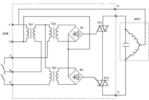 Пускатель бесконтактный реверсивный типа ПБР-2 изображённый на рисунке 3.11. Предназначен для управлением асинхронным однофазным конденсаторным электродвигателем, который используется в качестве приводов исполнительном механизме типа МЭО-160/25-0,68.