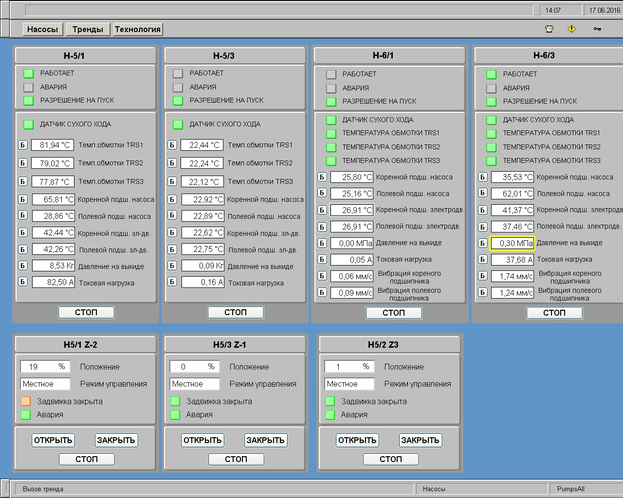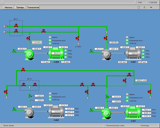 На данной мнемосхеме(Рисунок 3.26) изображены насосы, их обвязка состояние работы и параметры технологического процесса. Зеленым цветом подсвечены насосы, находящиеся в работе, при аварии или сработке блокировки, насосы будут подсвечены красным цветом. По данной мнемосхеме оператор может судить о состоянии насосов и их эксплуатационных параметрах.
