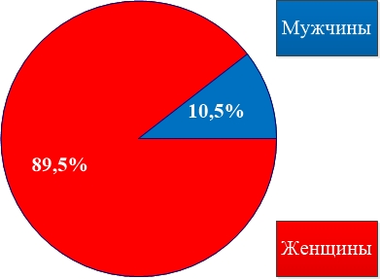 В УФПС ЕАО – филиал ФГУП «Почта России» по данным 2015 года работало 427 человек, из них 45 мужчин и 382 женщины, что составляет 10,5% мужчин и 89,5% женщин (Рисунок 2).
