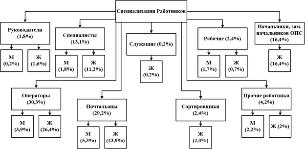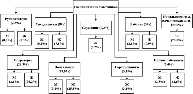 Из вышеизложенного можно сделать вывод, что большинство Работников на Предприятии – женщины. Средний возраст большинства Работников составляет: от 36 до 40 лет. Большинство на Предприятии занимаемых должностей – почтальонов и операторов связи, а также основная часть Работников имеют опыт работы в отрасли более 3 лет.