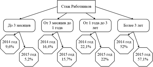 На рисунке 7 можно будет увидеть количество Работников по стажу в процентном соотношении за 2014 год и 2015 год.