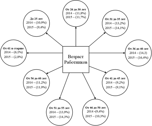 Судя по таблице и рисунку, можно сказать, что в 2014 и 2015 годах большинство Работников имеют возраст от 36 до 40 лет. В 2014 году работало 78 человек, что от общего числа Работников составило 14,3%, а в 2015 году 70 человек, что составило 16,4% от общего числа Работников на Предприятии. А самое малое количество Работников имеют возраст от 61и старше. В 2014 году работало 33 человека, что составило 6,1% от общего числа Работников, а в 2015 году 12 человек, что составило 2,8% от общего числа Работников.