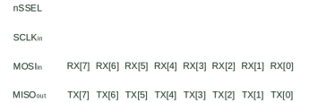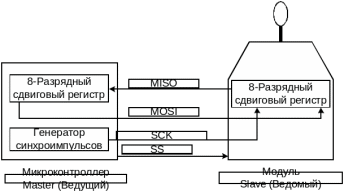 Обмен данными по SPI интерфейсу реализован следующим образом. Два 8-разрядных регистра (ведомого и ведущего устройства) образуют единый регистр сдвига, соединенный в кольцо линиями MISO и MOSI. С началом передачи включается генератор синхроимпульсов, с ведущего устройства начинают поступать данные по линии MOSI, одновременно вытесняя из ведомого биты по линии MISO. Через восемь тактов регистры полностью обмениваются информацией между собой [5].