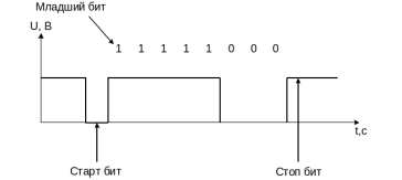 Синхронизация времени передачи происходит с помощью старт бита. После него идут восемь информационных битов, а затем стоповые биты, которых может быть, как один, так и несколько. Диаграмма, поясняющая процесс передачи данных по UART интерфейсу представлена на рисунке 1.6.