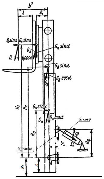 - высота от оси поворота грузоподъёмника соответственно до центра тяжести груза и подъёмной каретки с вилами, выдвижной и наружной рам и до оси крепления штока цилиндров наклона к наружной раме;