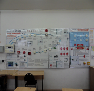 Данный стенд фирмы «MaviGard» является интерактивным демонстрационно-тренажерным стендом, но для изучения системы пожарной сигнализации. В цепь приемно-контрольного прибора, управляющего системой пожарной сигнализации, может быть подключен релейный модуль управления, который, в свою очередь, может подать сигнал на пожаротушение, но не может им управлять.