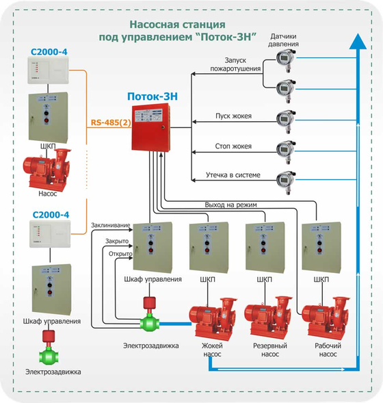 Прибор «Поток-3Н» имеет набор входов (контролируемых цепей), которые предназначены для подключения датчиков (электроконтактных манометров, датчиков потока), сигнальных цепей электрозадвижек и пусковых устройств. Прибор позволяет осуществлять запуск системы водяного пожаротушения по нескольким условиям: падение давления воды в системе, сработка кнопки запуска, дистанционные команды управления (при работе в составе системы). При возникновении одного из условий запуска, прибор подаёт сигналы управления на шкаф управления насосом – ШКП (шкаф контрольно-пусковой). В случае блокировки автоматического включения, шкаф обеспечивает возможность местного или ручного управления агрегатами. Так же ШКП позволяет отключать все виды управления. К прибору «Поток-3Н» возможно подключить до 20 дополнительных абонентов (например, приборов «С2000-4») по внутреннему RS-485 (2) интерфейсу, которые можно использовать для управления дополнительным технологическим оборудованием.