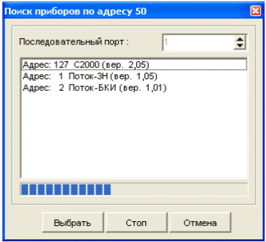 По окончании процедуры поиска на экране появится список всех подключенных к выбранному порту приборов. В списке указаны сетевой адрес и номер версии каждого из найденных приборов.