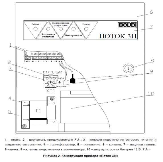 1 – плата; 2 – держатель предохранителя FU1; 3 – колодка подключения сетевого питания и защитного заземления; 4 – трансформатор; 5 – основание; 6 – крышка; 7 – лицевая панель; 8 – замок; 9 – клеммы подключения к аккумулятору; 10 – аккумуляторная батарея 12В, 7 А·ч