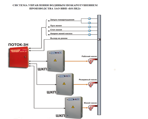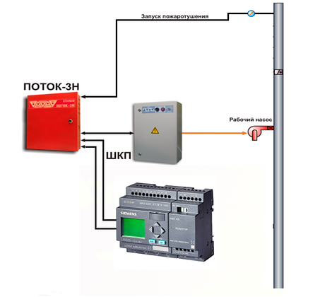 При срабатывании реле ЭКМ, поступает сигнал на «Поток-3Н», который переходит в режим «ПОЖАР». Переключаются режимы работы «ШКП-4» и включается основной насос. Сопротивления на соответствующих клеммах принимают значения: