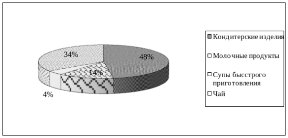 Данные табл.8. и рис.3 подтверждают ранее сделанное заключение (в процессе анализа структуры товарооборота в ассортиментном разрезе) о том, что наибольший удельный вес составляют группы «Кондитерские изделия», «Молочные продукты». Кроме того, ассортимент чая также представлен довольно полно и составляет 34,5% от общего показателя.