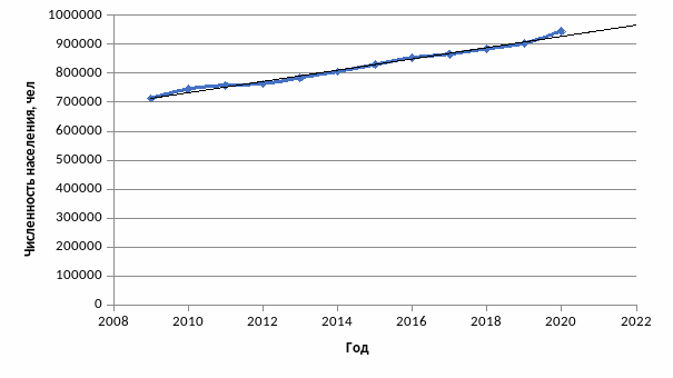 Как видно из рисунка, изменение численности населения проходит в линейной зависимости и полученные данные максимально близки к линии тренда.