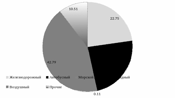По данным таблиц 1.1 и 1.2 видно, что наибольшая доля пассажирских перевозок на протяжении периода с 2005 по 2015 год приходится на воздушный – 42,79% и железнодорожный транспорт – 23,83% в общей структуре пассажирооборота отрасли. Причем популярность воздушного транспорта возрастает с каждым годом.