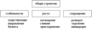 - стратегия сокращения применяется в тех случаях, когда выживание организации находится под угрозой (разновидностью этой стратегии являются: стратегия разворота - отказ от неэффективного использования ресурсов и поиск новой стратегии; стратегия отделения - продажа структурного подразделения или выделение его в самостоятельную организацию; стратегия ликвидации - распродажа активов) [19].