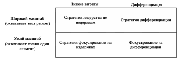 - сфокусированная стратегия, или стратегия рыночной ниши, основанная на дифференциации продукции (полное удовлетворение требований клиентов из выбранного сегмента).