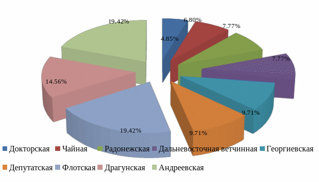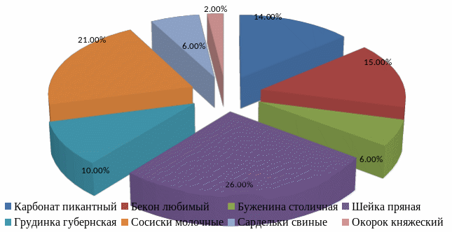 Наибольшим спросом пользуются колбасные изделия «Андреевская» - 19 %, «Флотская» - 19 % и «Драгунская» - 14 %. Наименьшим спросом пользуется колбаса «Докторская» - 5 % и «Чайная» - 7 %.