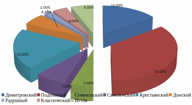 Наибольшим спросом пользуется хлеб «Подольский» - 35 %, «Крестьянский» - 20 % и «Димитровский» - 15 %.