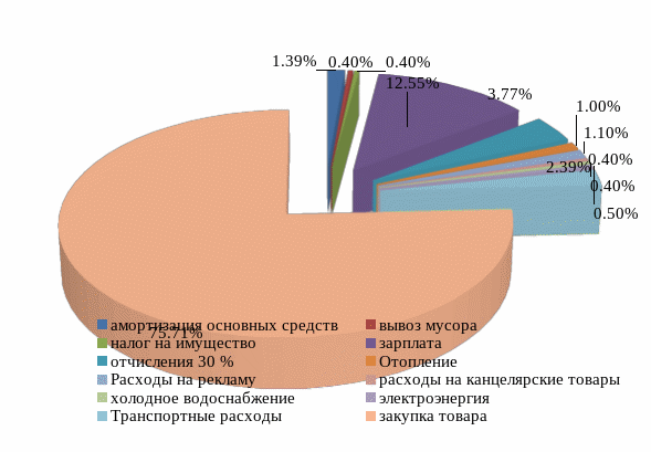 Как видно из рисунка 3, больше всего затрат 76 % - это закупка товара, 13 % - это заработная плата персонала.