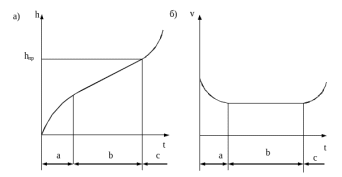 Интенсивность и скорость изнашивания, как правило, не остаются постоянными во времени (рисунок 2.1). Процесс изнашивания обычно происходит в три стадии. На первой стадии (участок а) происходит приработка детали, сопровождаемая интенсивным износом. Далее процесс изнашивания стабилизируется (участок b), скорость изнашивания практически постоянная (рисунок 2.1, б). Этот участок характеризует нормальную работу узла. Постепенное изменение размеров трущихся деталей, приводящее к ухудшению условий смазывания, появлению динамических нагрузок в соединении и др., вызывает катастрофическое увеличение скорости изнашивания на участке с.