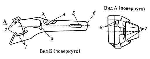 Трещины 7 и 8 в углах окон для замка и замкодержателя могут устранятся при условии, что разделка трещин в верхних углах окна для замка не выходит на горизонтальную поверхность головы, в верхнем углу окна для замкодержателя не выходят за положения верхнего ребра со стороны большого зуба, а длина разделанной трещины в нижних углах окон не превышает 20 мм.