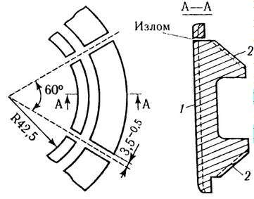 Сила прижатия к втулке, износ зависят от состояния конических поверхностей сухарей и колец. Поэтому в один комплект гасителя должны подбираться сухари по возможности одинаковых размеров, которые определяются шаблоном (рисунок 3.7). Разница в размерах сухарей одного комплекта не должна превышать 2 мм по толщине и высоте.