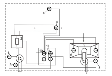 Рисунок 5.3.2 - Функционально-технологическая схема системы вентиляции сварочного цеха: 1 – электродвигатель приточного вентилятора, 2 - калорифер, 3 - датчик температуры приточного воздуха, 4 - датчик температуры внутри помещения, 5 - датчик температуры приточного воздуха, 6 - фотодатчик, 7 - датчик загазованности, 8 - электродвигатель вытяжной вентиляции, 9 – вытяжной зонт, 10 - устройство управления, 11 - исполнительные механизм