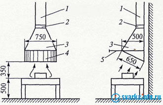 Рис. 5.3.1 - Схема отсоса газов, выделяющихся при сварке, от сварочного поста: 1 - воздухопровод; 2 - шибер; 3 - воздухоприемник; 4 - штампованная решетка; 5 - козырек.