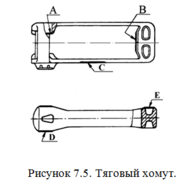 На тяговом хомуте (рисунок 1.2.5) упрочнению ГПН подлежат: оверхности А потолка проема головной части хомута; места B на задней опорной поверхности хомута; места C на тяговых полосах; поверхности D и E.
