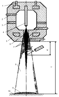 Плазменная струя оформляется медным соплом. Благодаря охлаждающему действию стенок сопла наружные слои столба деионизируются и объем ионизированной части столба уменьшается. Это приводит к повышению напряжения дуги и значительному увеличению плотности тока в столбе. Плазменная струя обжимается еще и магнитным полем, создаваемым потоком заряженных частиц в плазме. Обжатие плазменной струи способствует росту ее температуры. Нагретый ионизированный поток газа выносится с высокой скоростью из сопла в виде яркосветящейся плазменной струи высокой температуры (5 000–15 000 ºС). Как уже отмечалось, мощность плазмотрона зависит от размеров межэлектродного пространства. Коэффициент полезного действия плазмотрона 60–80 %, примерно 0,8 всей мощности плазмотрона расходуется на нагрев плазмообразующего газа. Наибольшему разрушению подвергается сопло плазмотрона, поэтому оно изготавливается из меди и делается сменным. Срок службы сопла зависит от режима работы плазмотрона, вида плазмообразующего газа, его чистоты по содержанию кислорода и влаги, системы охлаждения и составляет от 15 до 1000 ч.