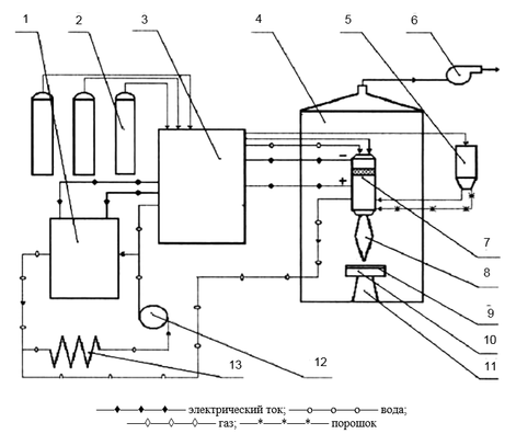 Рисунок 3.4.1 - Принципиальная схема плазменной установки УМП-6: 1 – источник питания; 2 – баллоны с газом; 3 – пульт управления; 4 – камера напыления; 5 – порошковый дозатор; 6 – вытяжной вентилятор; 7 – плазмотрон; 8 – плазменная струя; 9 – напыленное покрытие; 10 – изделие; 11 – устройство для перемещения изделия; 12 – водяной насос; 13 – холодильник.