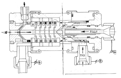 Отрицательный вывод источника постоянного тока присоединяется к вольфрамовому стержню-катоду, а положительный к соплу-аноду. Плазмообразующий газ подается во внутреннюю межэлектродную камеру, образованную медным соплом-анодом и вольфрамовым электродом.